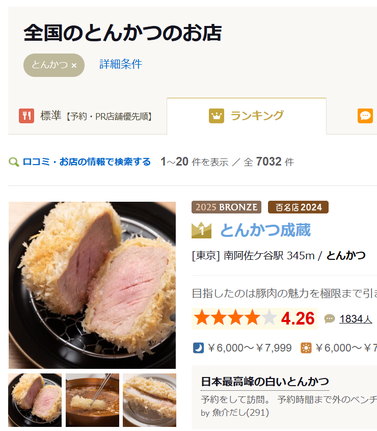- 食べログ「とんかつ」評価 全国一位